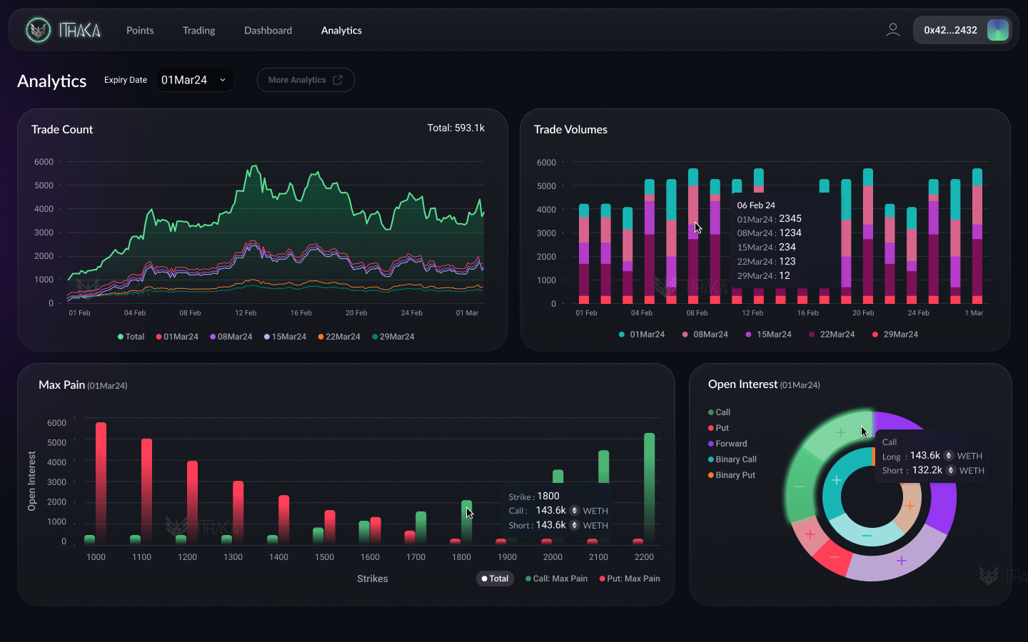 Open Interest offers a snapshot of the market detailing open contracts for a selected expiry, split by asset and type.