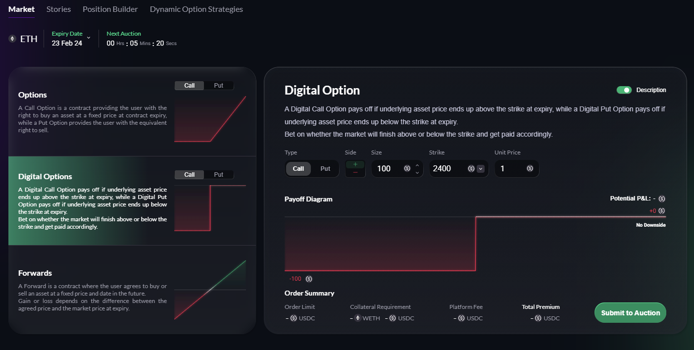 <table><thead><tr><th width="202">Item</th><th>Description</th></tr></thead><tbody><tr><td>Products</td><td><p>Binary Call Option (Binary Call)</p><p>Binary Put Option (Binary Put)</p></td></tr><tr><td>Payout Formula</td><td>Call    if Reference Price > Strike then 1, else 0<br>Put     if Reference Price &#x3C;= Strike then 1, else 0</td></tr><tr><td>Underlying</td><td>WETH/USDC</td></tr><tr><td>Settlement Style</td><td>Ithaca settlement</td></tr><tr><td>Premium Currency</td><td>USDC</td></tr><tr><td>Strike Currency</td><td>USDC</td></tr><tr><td>Collateral Currency</td><td><p>Call    USDC</p><p>Put     USDC</p></td></tr><tr><td>Collateral Amount</td><td><p>Call    1 </p><p>Put     1</p></td></tr><tr><td>Collateral Management</td><td>Fully collateralized, pre-funded</td></tr><tr><td>Multiplier</td><td>1</td></tr><tr><td>Reference Price</td><td>ITHACA Reference Fixing</td></tr><tr><td>Expiry Dates</td><td>( Ithaca Expiry )</td></tr></tbody></table>